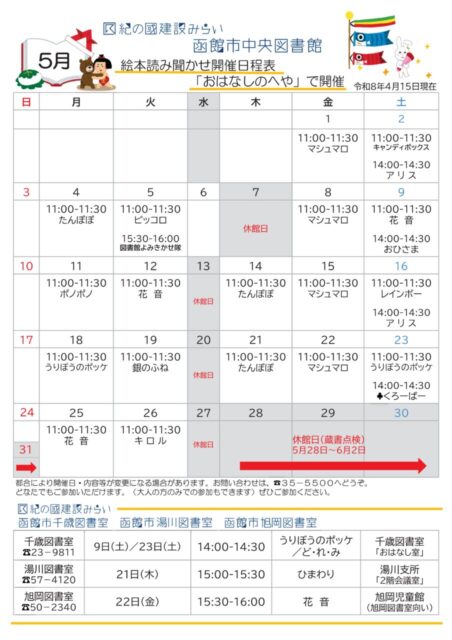 紀の國建設みらい 函館市中央図書館、函館市地区図書室の2026年5月の絵本読み聞かせ開催日程です♪
