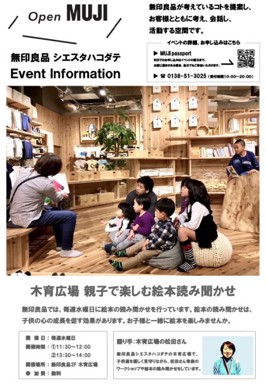 無印良品では、毎週水曜日に絵本の読み聞かせを行っています。絵本の読み聞かせは、子供の心の成長を促す効果があります。お子様と一緒に絵本を楽しみませんか。