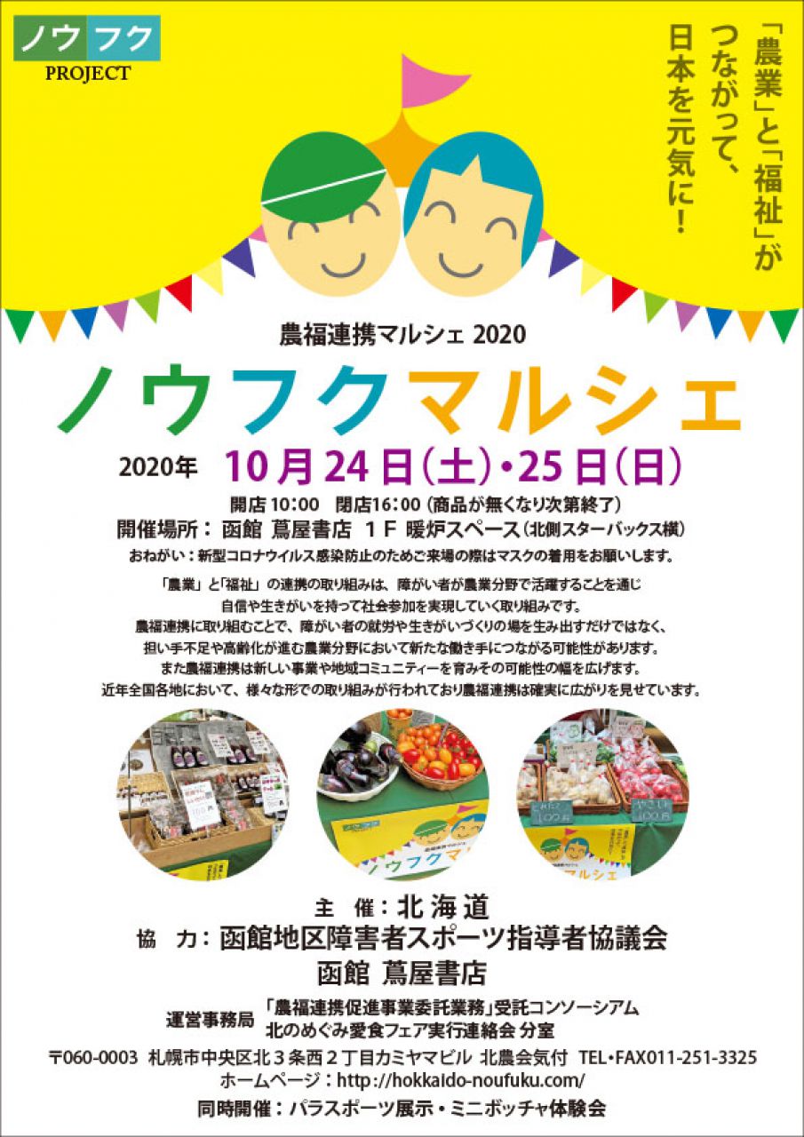 「農業」と「福祉」の連携の取り組みは、障がい者が農業分野で活躍することを通じ自信や生きがいを持って社会参加を実現していく取り組みです。農福連携に取り組むことで、障がい者の就労や生きがいづくりの場を生み出すだけではなく、担い手不足や高齢化が進む農業分野において新たな働き手につながる可能性があります。新しい事業やコミュニティを育み、可能性を広げるこの連携事業を、野菜や加工品などの販売を通じて、皆様へ発信するイベントです。