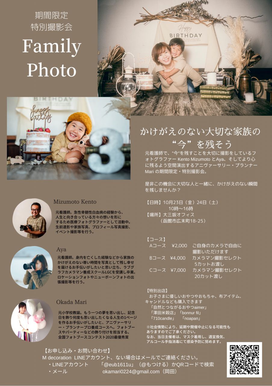 落ち着かないご時世が続く昨今、今ある家族との時間は当たり前ではないと感じられた方も多いと思います。そこで、「かけがえのない家族の”今”を残そう」をテーマに、元看護師で現カメラマンのKento Mizumoto さんとAya さんと企画した撮影会です。お2人はは前職看護師をしていたことや、自身の病気の経験、大切な家族との別れを経験しており、”今”を残すことを大切にしている方達です。今回の撮影ブースはナチュラルで落ち着いた世界観で、より表情が際立つようにしました^ ^