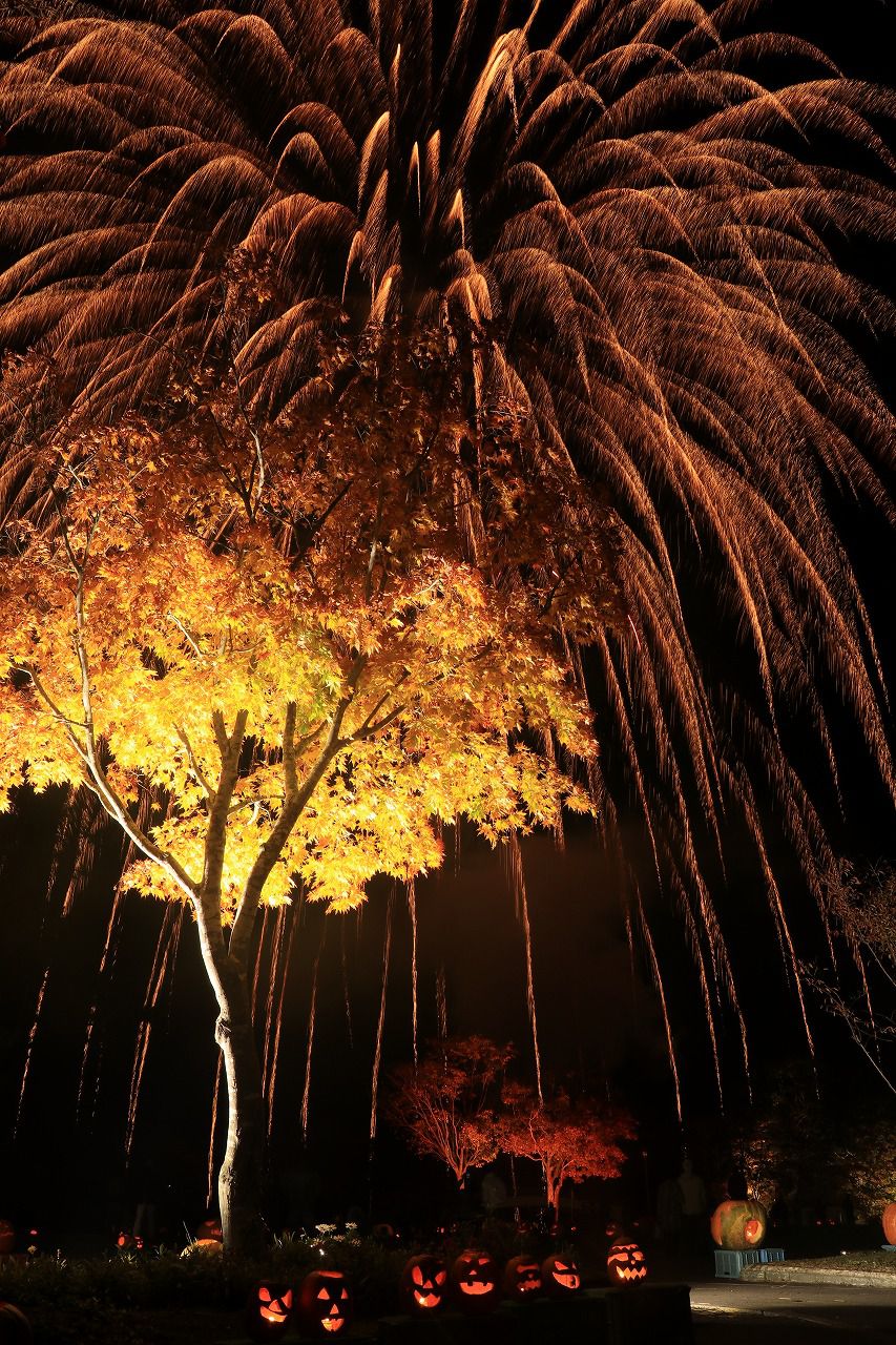 日没後の公園広場には、かぼちゃランタンが並び、園内を淡く照らします。大沼に浮かぶ大小さまざまな島もライトアップされ、幻想的な光景に(*^^*)