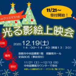 申込受付 11月21日(土)~12月13日(日)受付。下記「光る影絵」チラシ裏面の申込書へご記入の上、直接中央図書館カウンターへお申込みください。