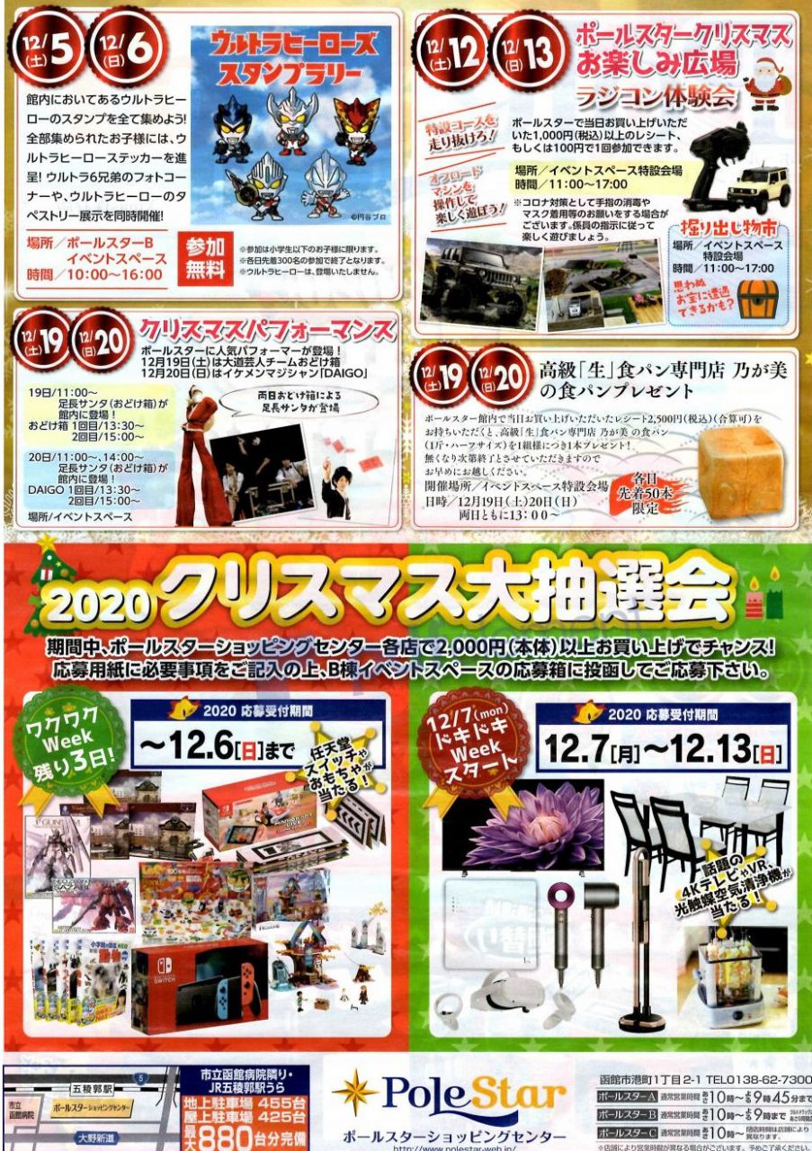 4Kテレビなど豪華賞品が当たる週替わりのクリスマス大抽選会や、ラジコン体験会、館内で当日お買い上げのレシート2500円で高級「生」食パン専門店 乃が美の食パン(ハーフサイズ)を、先着50本限定でプレゼント!