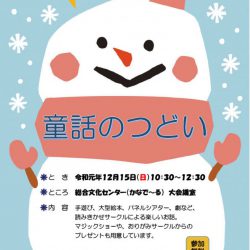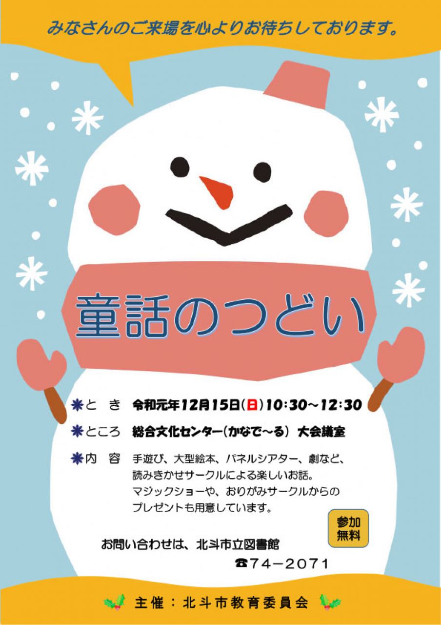 童話のつどい イベント 2019.12.02 2019年12月15日(日) 開催場所 総合文化センター(かなで~る)大会議室 内容 手遊び、大型絵本、パネルシアター、劇など、読みきかせサークルによる楽しいお話。 マジックショーや、おりがみサークルからのプレゼントも用意しています。 時間 10:30~12:30 参加料 無料 ※このイベントは終了しました※