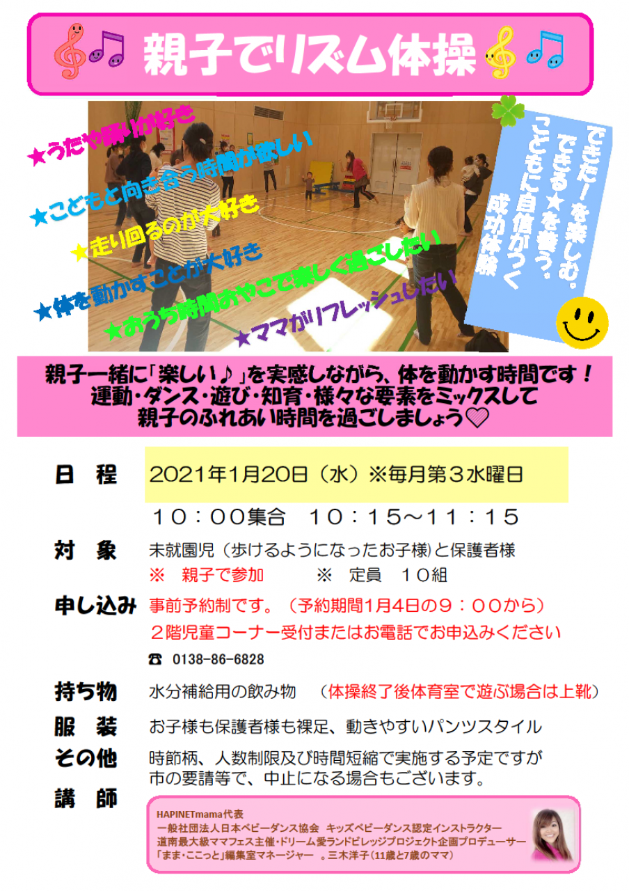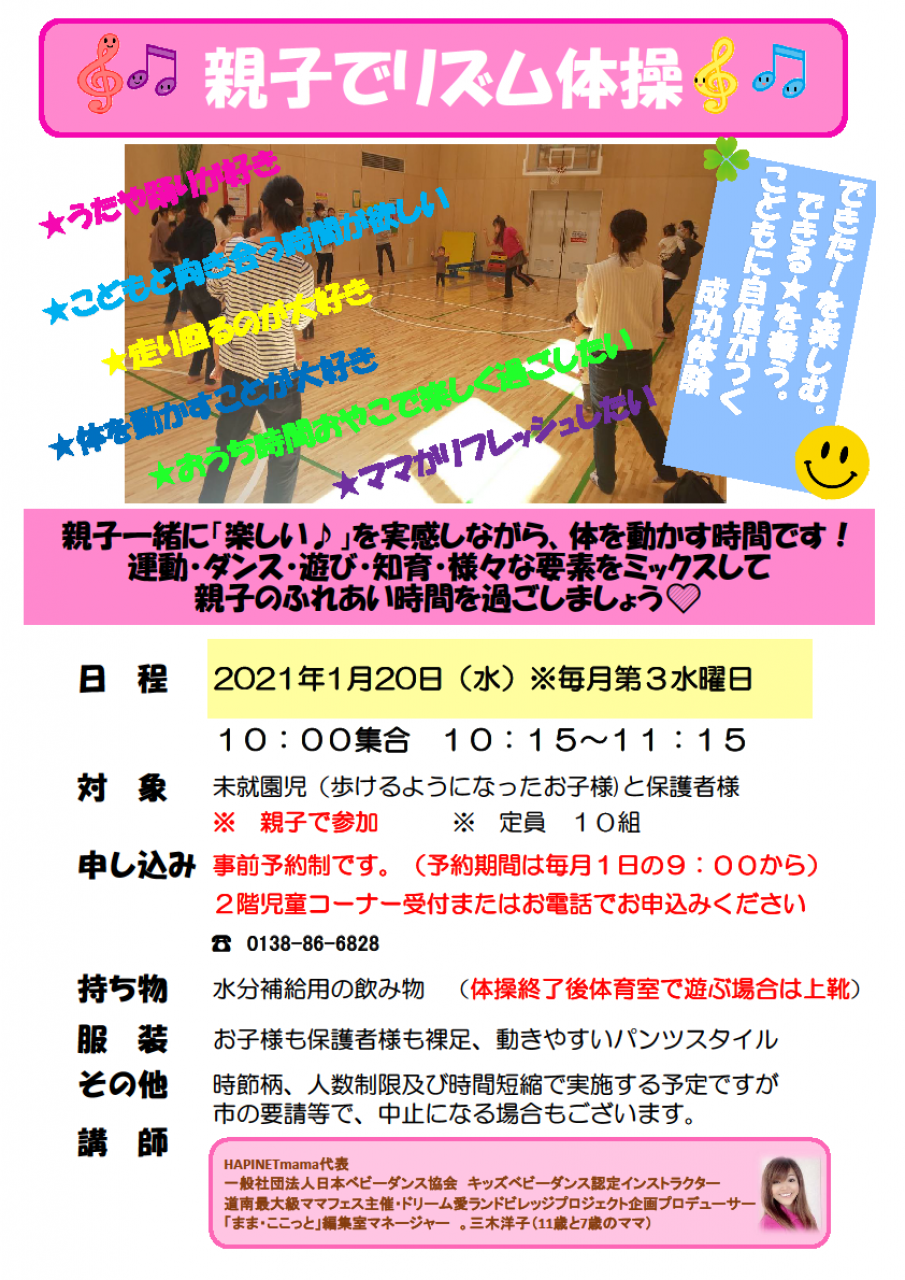 持ち物 水分補給用の飲み物、体操終了後体育室で遊ぶ場合は上靴