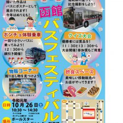 函館市内のみならず、みなみ北海道の足として活躍する、函館バスのイベントが開催されます。会場は、JR五稜郭駅裏の函館ポールスターショッピングセンター駐車場。