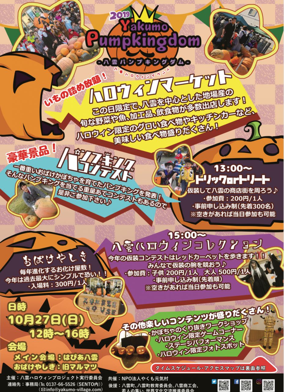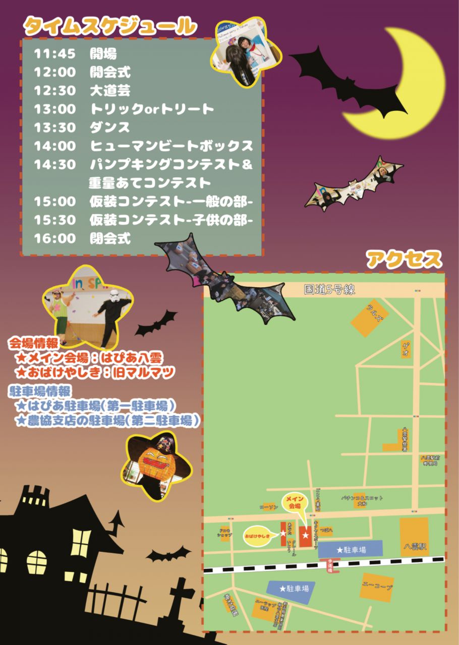 八雲町を中心とした野菜や魚介、ハロウィン限定の食べ物やその他物産が集まるハロウィンマーケットや子ども向けのゲームコーナー、ワークショップなども開催。