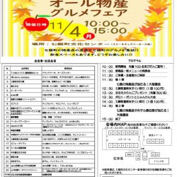 七飯町で行われる物産フェア。地元の食材を使った新商品や新メニューを発表する他、文化センター駐車場で農畜産物の直売を行います(10:00から12:00)。また、地元産のりんごのプレゼント(13:00から、先着300名)や、会場内の3店舗で各500円以上買い物すると参加できる、特産品や豪華宿泊券などの景品が当たるお楽しみ抽選会(11:30、14:30)なども行われます。