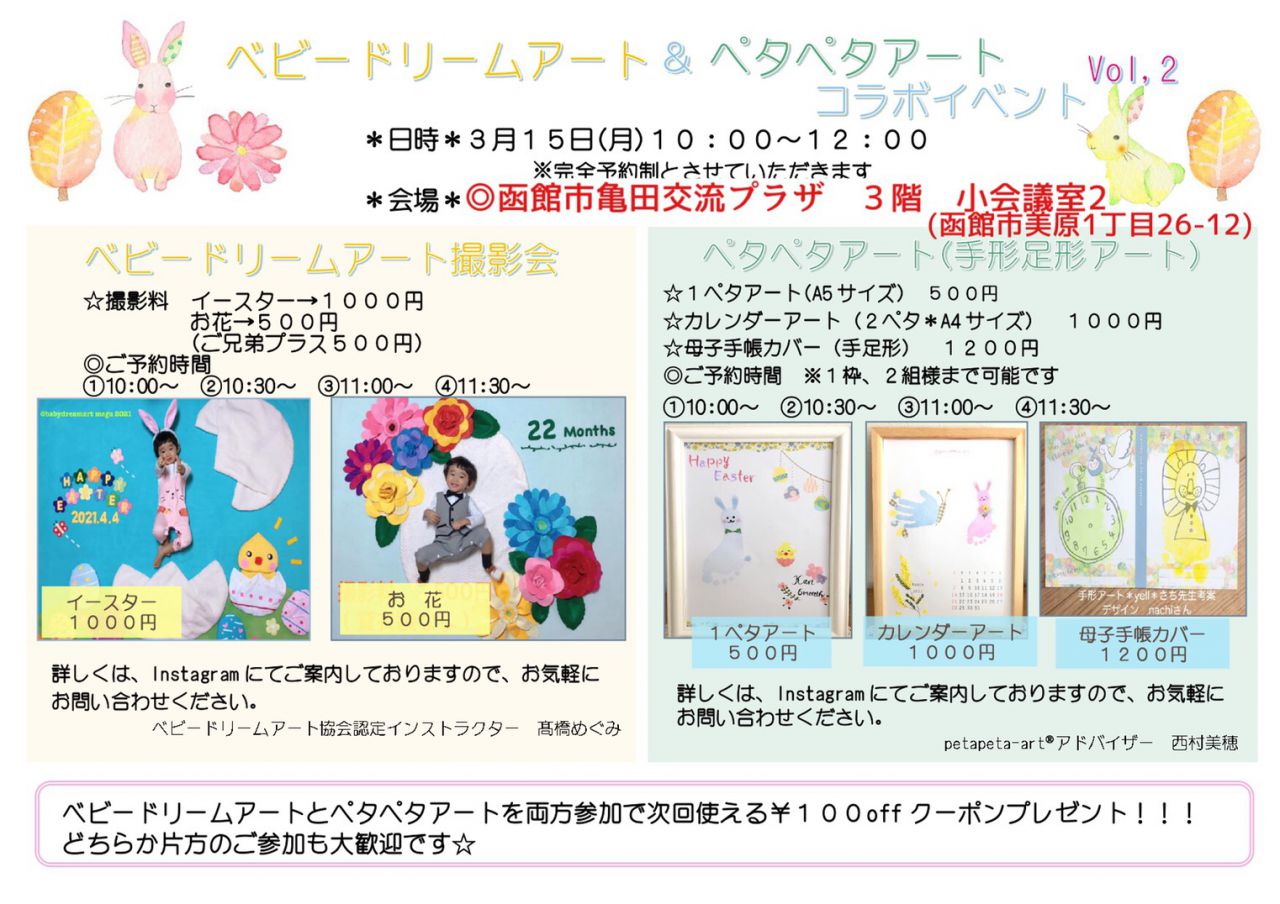 申込受付 完全予約制 インスタグラム、もしくは下記のメールアドレスよりお問い合わせください。髙橋、西村どちらかにご連絡いただけますと、ベビードリームアート・ペタペタアート両方の予約を取ることも可能です。