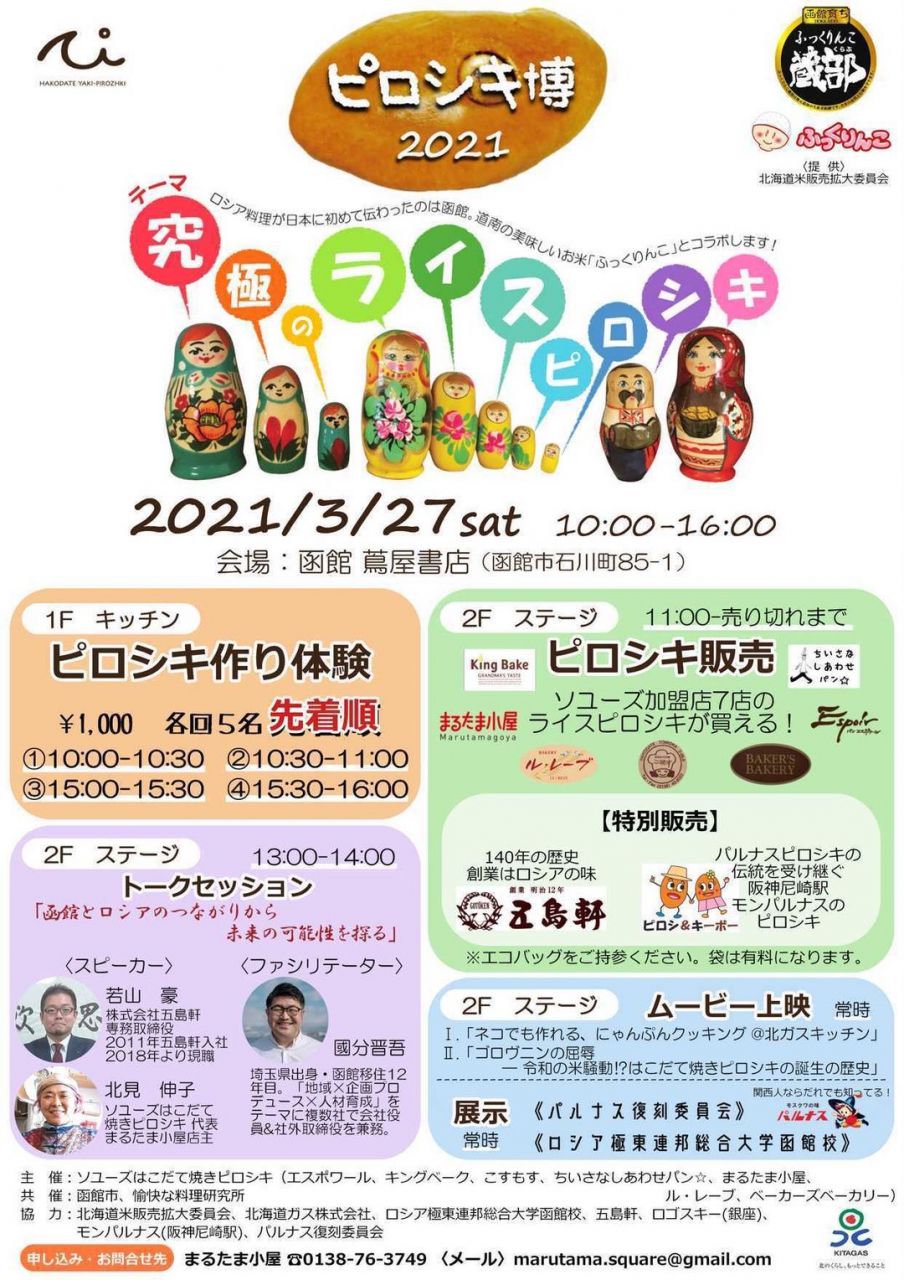 ピロシキ作り体験や(先着順)、販売ブースではソユーズ加盟店7店のライスピロシキに加え、特別販売企画として五島軒、関西圏で人気のモンパルナスのピロシキがやってきます♪トークセッションや、2階ステージではムービー上映も行われます♪それぞれのタイムテーブルはチラシをご覧ください♪