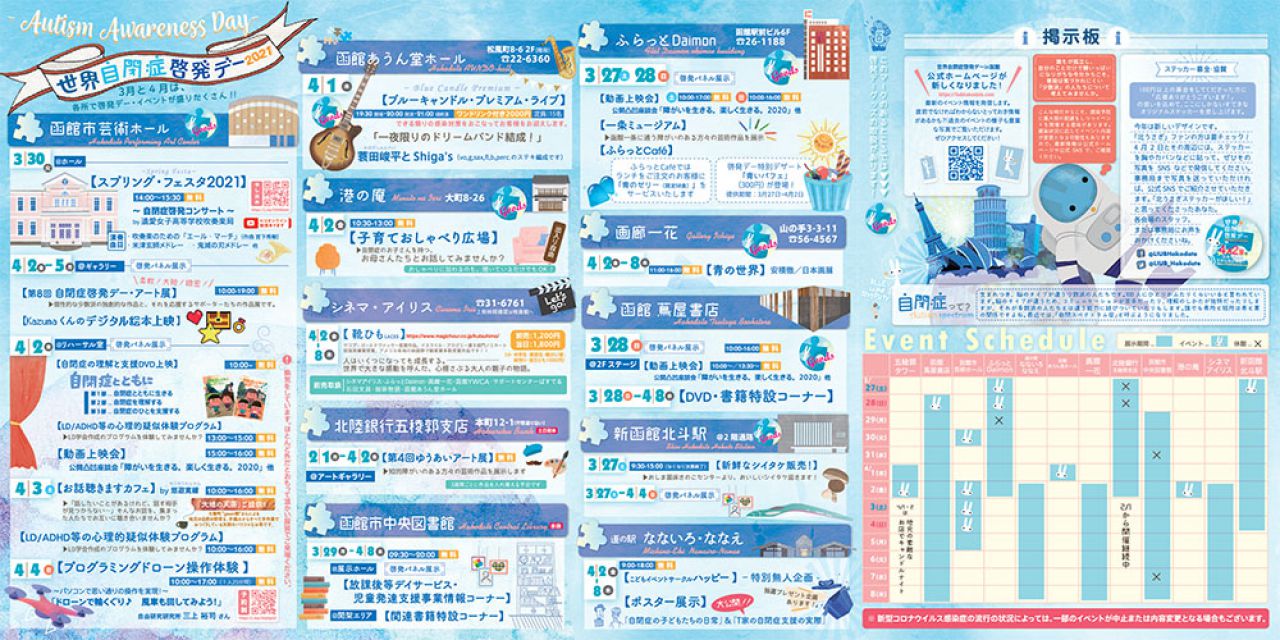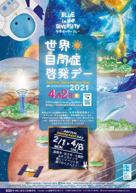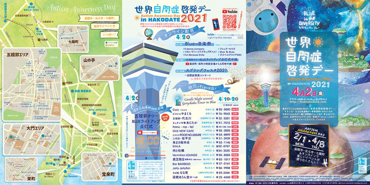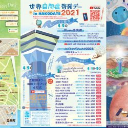 この日は、世界中のランドマークがシンボルカラーのブルーにライトアップされ、様々なイベントを通じて世界中の人々が自閉症について知り、考え、話し合っています。函館でも、五稜郭タワーのブルーライトアップをはじめとして、幅広い方々に自閉症について関心をもっていただくためのイベントを開催しています。