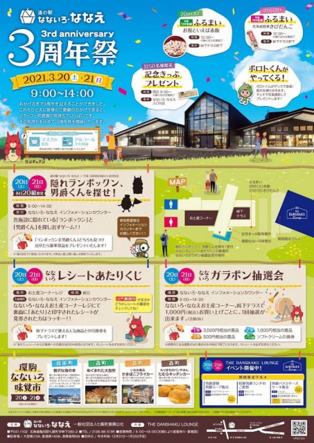 「道の駅 なないろ・ななえ」がオープン3周年を迎えます♪赤飯やきびだんごのふるまい(なくなり次第終了)の他、ガチャポン抽選会、レシートあたりくじなど、楽しい催しが盛りだくさん♪環駒なないろ味覚市では、鹿部町、森町のおいしい水産加工品が多数登場します。