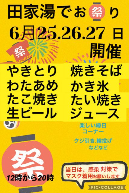 田家湯でお祭り イベント 2021.05.27 2021年6月25日(金)~2021年6月27日(日) 開催場所 田家の湯(函館市田家町5-11) 田家湯でお祭りが今年も開催されます♨楽しい縁日コーナーやクジ引き、輪投げなどなど(^^)/ やきとりやたこ焼き、わたあめやかき氷もありますよ~!! ※当日は、感染対策でマスク着用お願いします 昨年好評のうちに幕を閉じた、田家湯でお祭りが今年も開催♪感染対策もしっかり行われますので安心して参加できますよ♪ 時間 各日12:00~20:00 ※このイベントは終了しました※