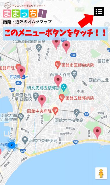 マップの右上にあるメニューボタンをタッチすると、現在掲載中のお店や施設が一覧表示されます(あいうえお順)♪