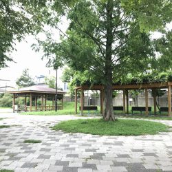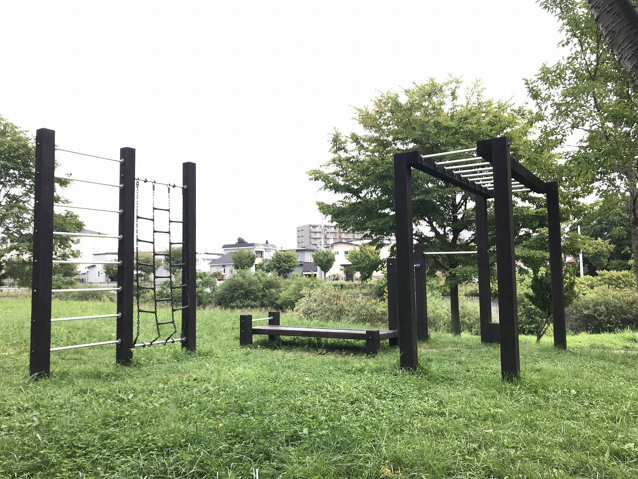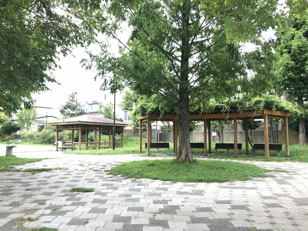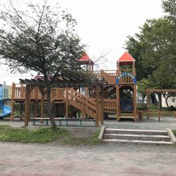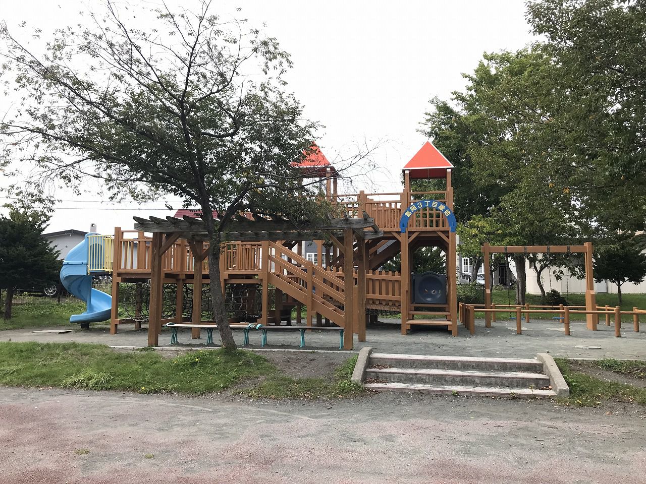 富岡3丁目緑地 公園 2019.08.28 函館市中道2丁目36 亀田川が横を流れる静かな公園です。大きな遊具があり、綺麗なバスケコートもあります。 緑に囲まれた屋根付き休憩スペースがあり、癒しの空間でした♪ 水飲み場、トイレもありです(^^)/