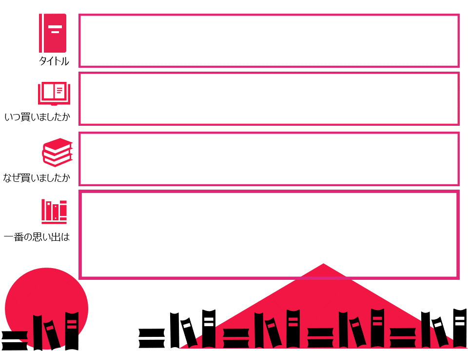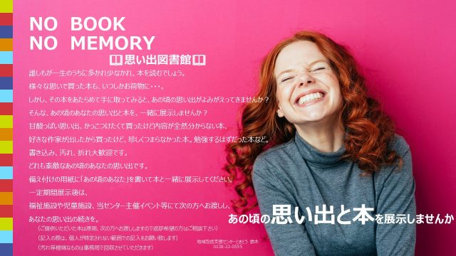 手離すことのできない大切にしてきた本を、あなたの思い出と共に展示します。大きな影響を受けた本、甘酸っぱい思い出が詰まった本、かっこつけたくて買ったけど実は内容が全然わからない本などなど、本にまつわる様々な思い出と一緒にご紹介。一定期間展示後は、福祉施設や児童施設、当センター主催のイベントで次の方にお渡しします。書き込み、汚れ、折れ大歓迎です。参加の方法は下記の通り。