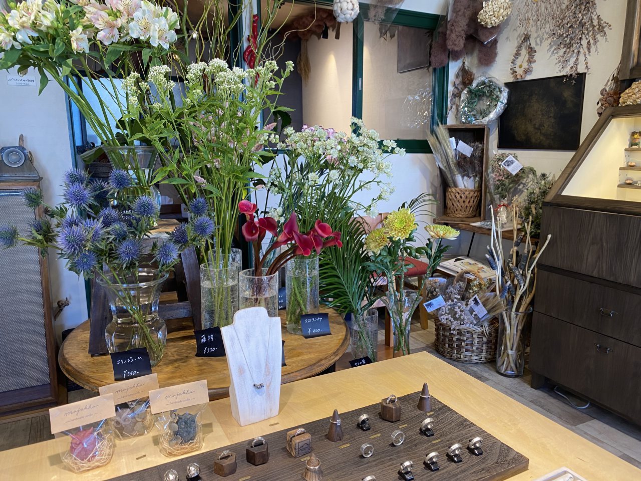「muku handmade HAKODATE」では、ハンドメイドアクセサリーと一緒に色鮮やかな花が陳列され、プレゼントに購入した品に花を一輪添えるお客様もいるという。なんだか粋で素敵ですよね。