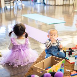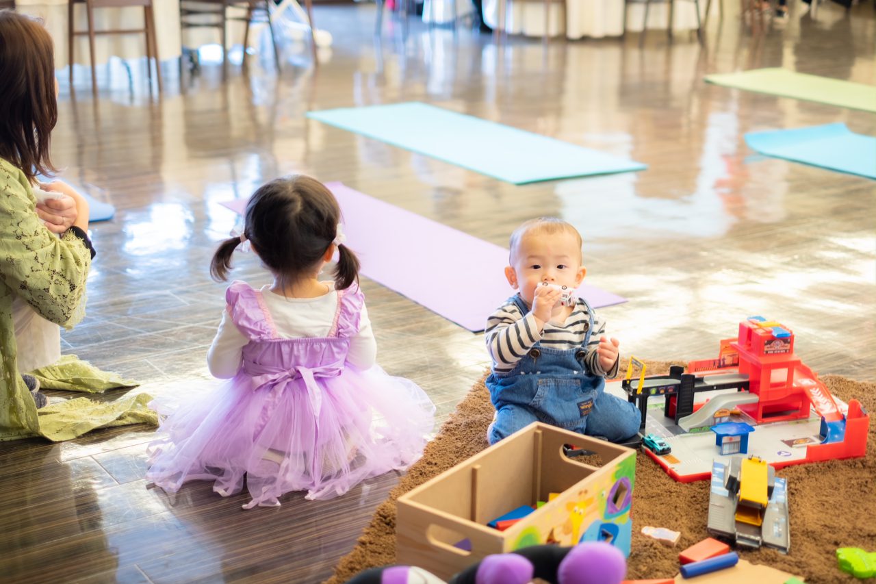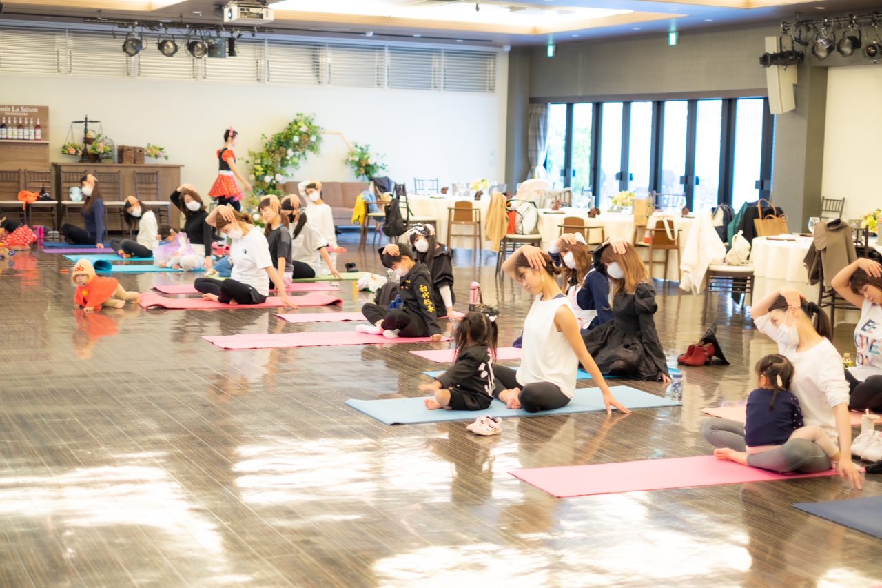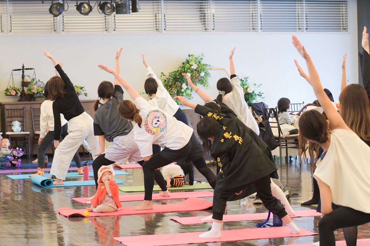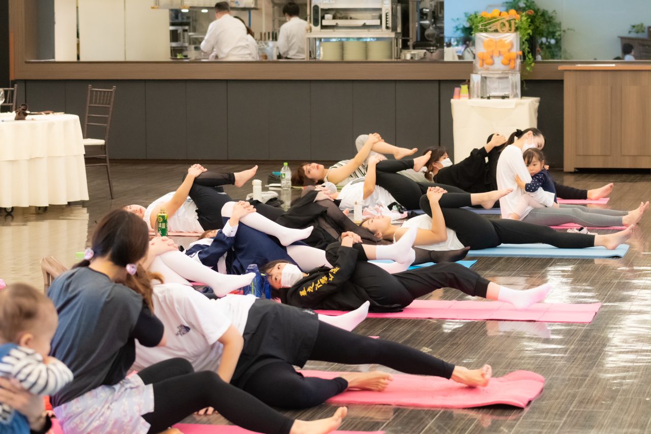 ママヨガは毎日頑張っているママのリフレッシュタイム。お子様の参加は自由です。レッスン中は他の講師の皆さんでお子さんのサポート行っています。広い会場内にはキッズスペースもありますよ♪
