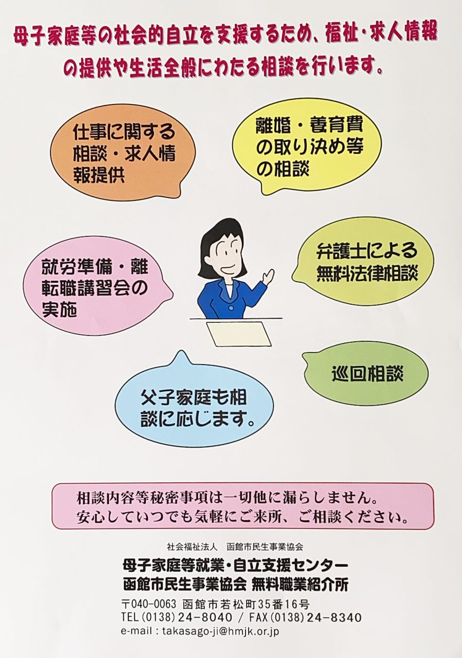母子家庭等の社会的自立を支援するため、求人情報の提供や生活全般にわたる相談を受けてくれる場所で、開設から18年目を迎える強い味方です!