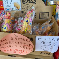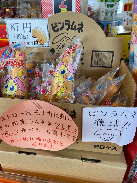 ・ビンラムネ(87円)ストローをモナカに刺し、中の粉末ラムネを少しづつ吸って食べるお菓子です。