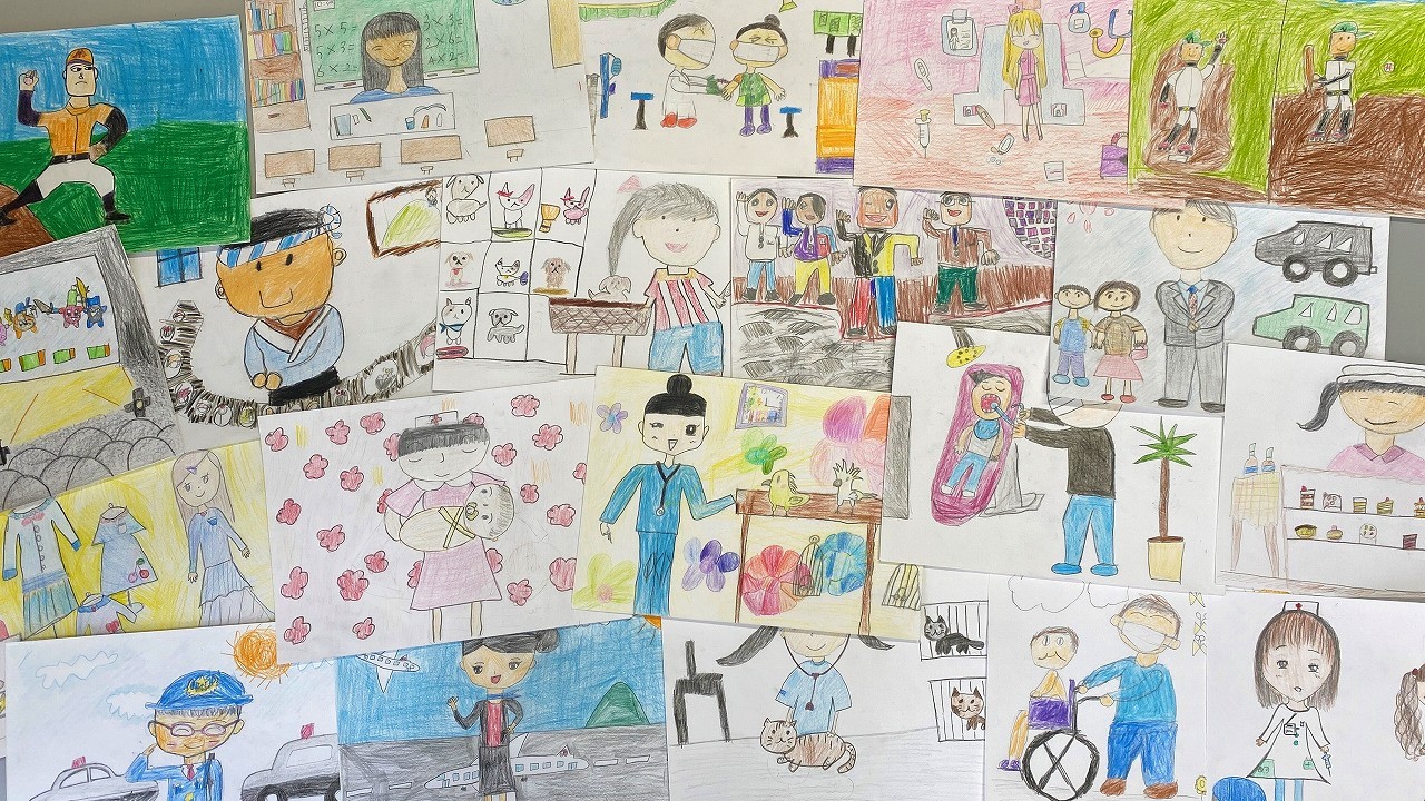 今まで幼稚園のみんなに参加してもらっていた【あつまれ!ちびっこ画伯♪】。第6回目は小学生のお兄さん、お姉さんが参加!認定こども園高丘幼稚園内にある学童保育スピリッツのみんなが、『将来なりたい職業』をテーマに楽しい様子を描いてくれました(*^^*)