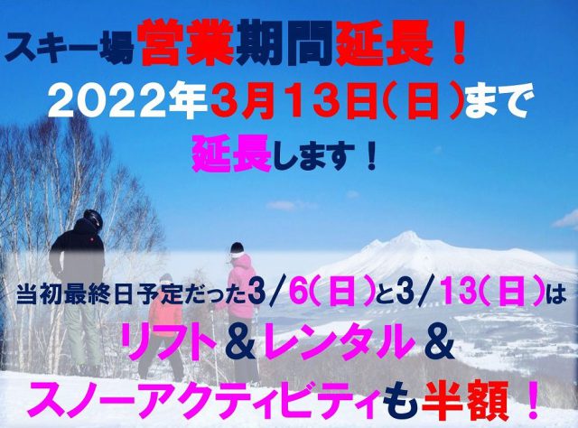 ある程度滑走技術が向上したら、グリンピア大沼スキー場の「ミルキーウエイ」コースにも挑戦させてみてください。なお、下のポスターのとおり3月6日(日)と3月13日(日)は、リフトやレンタルが半額になるようなので、スキーや靴などをレンタルしてお子さんに最適な用具選びの参考にしてみては如何でしょうか。スキーレッスンもおすすめです!