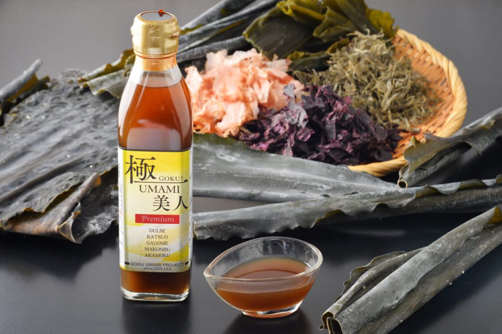 【極UMAMI美人】は、函館産の「真昆布」「根昆布」「ガゴメ昆布」や、スーパーフードとして注目されている「ダルス」「アカモク(北海道産)」といった道南で獲れる海藻の旨味を抽出した濃縮液体出汁です。