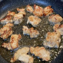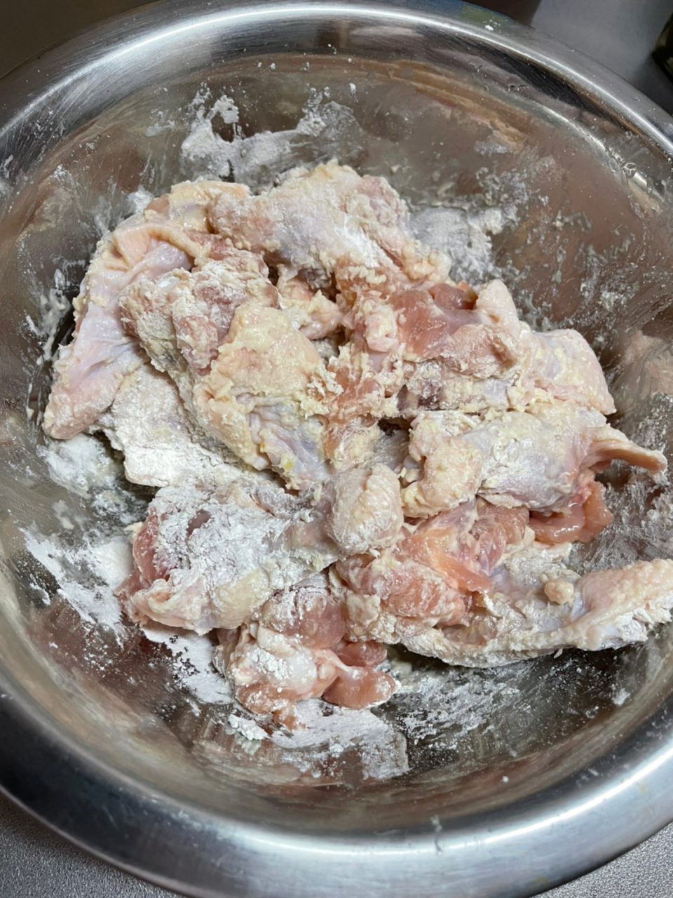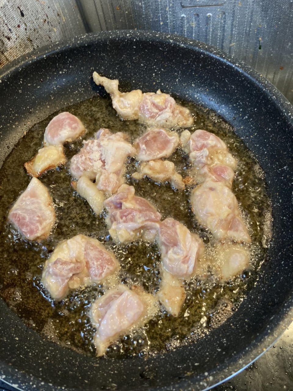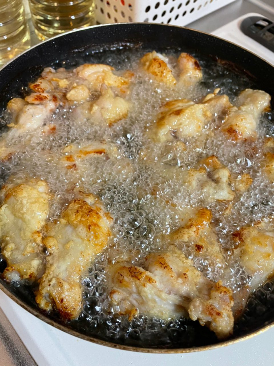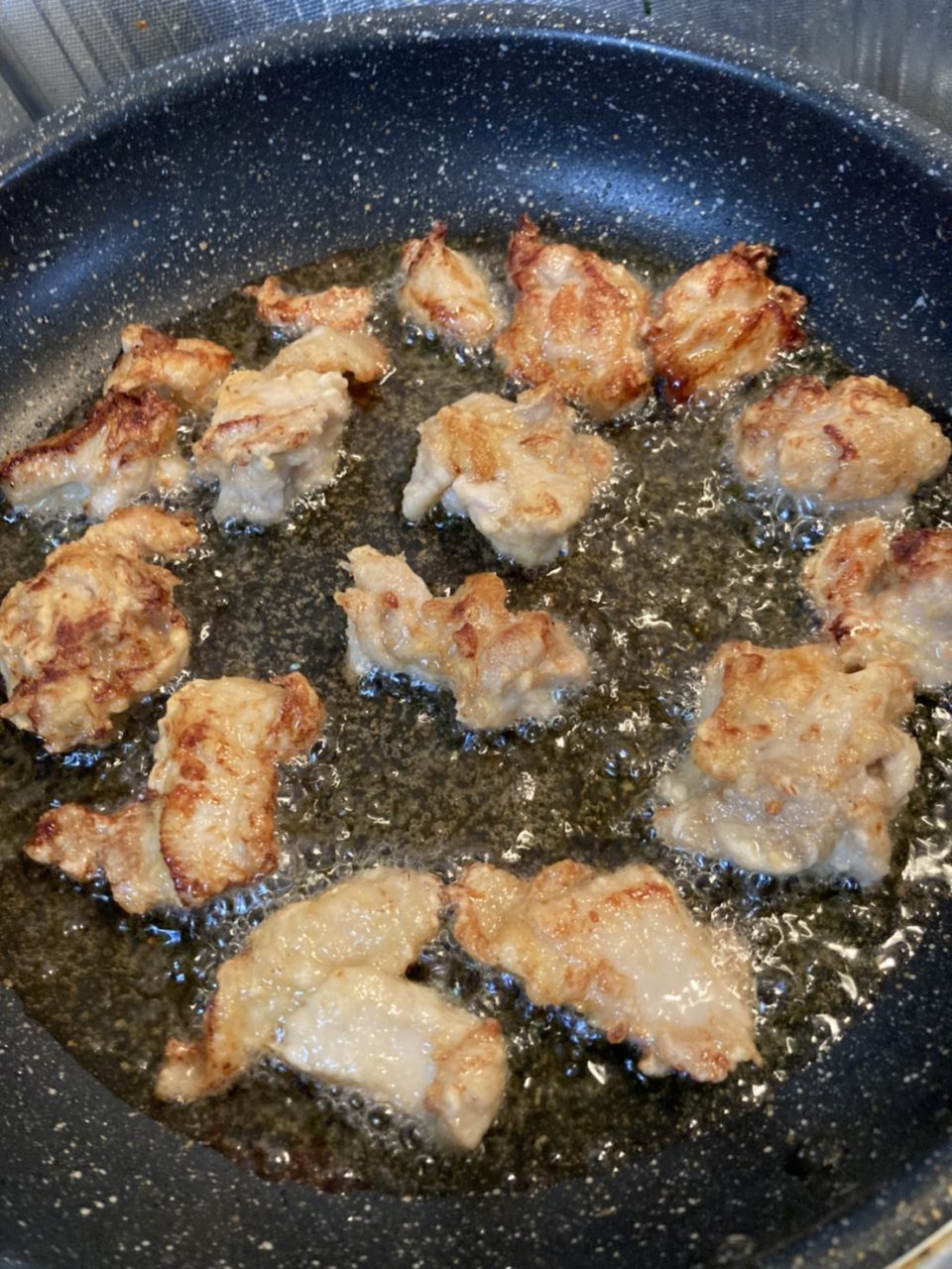 2品目の唐揚げ、ポリ袋に入れ下味を揉み込む作業を息子にもお手伝いしてもらいました♪前日の晩ごはん準備の際に、えいやー!とついでに下準備し冷蔵庫で一晩寝かせ、揚げる時に袋に「マヨネーズ大さじ1、片栗粉と米粉を大さじ2ずつ」入れてさらに揉み揉み♪袋に粉を入れ揉み込むことでさらに時短に成功!コクを感じられて美味しい味付け具合でした!