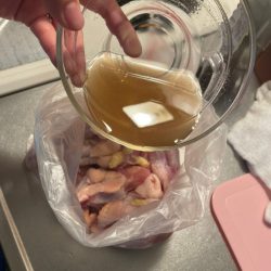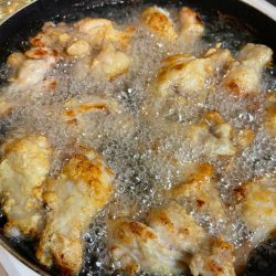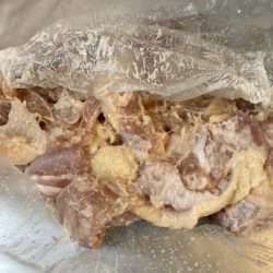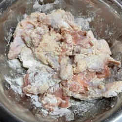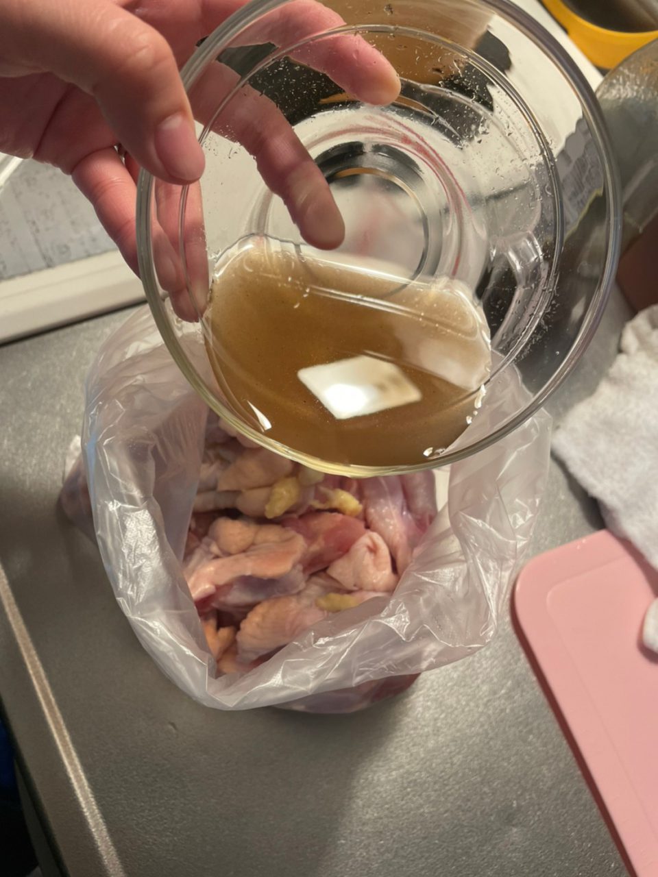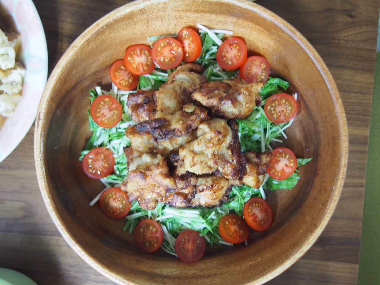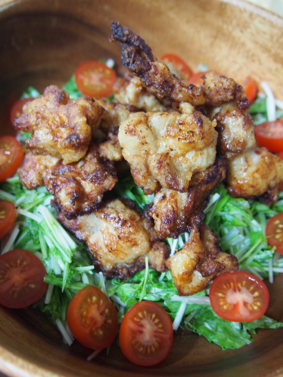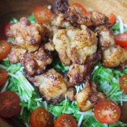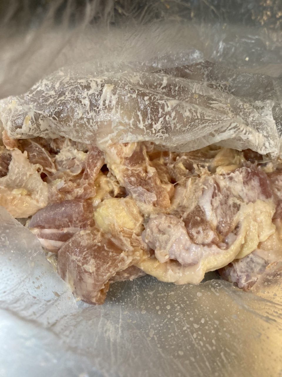 2品目の唐揚げ、ポリ袋に入れ下味を揉み込む作業を息子にもお手伝いしてもらいました♪前日の晩ごはん準備の際に、えいやー!とついでに下準備し冷蔵庫で一晩寝かせ、揚げる時に袋に「マヨネーズ大さじ1、片栗粉と米粉を大さじ2ずつ」入れてさらに揉み揉み♪袋に粉を入れ揉み込むことでさらに時短に成功!コクを感じられて美味しい味付け具合でした!
