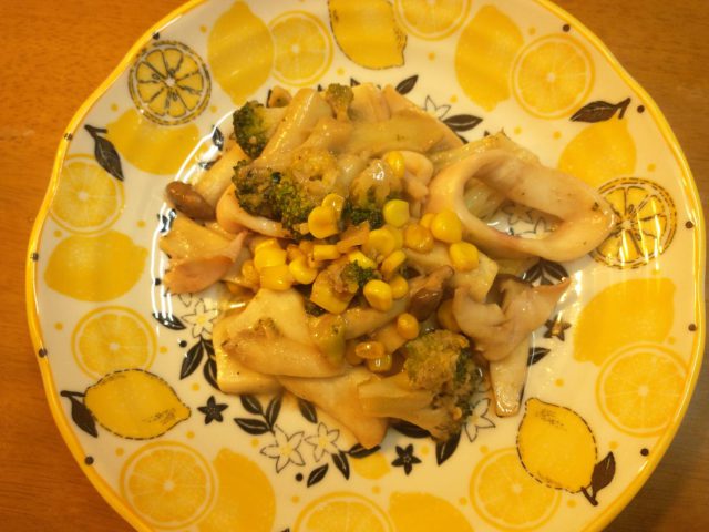 オリジナルレシピ:イカ、ブロッコリー、エリンギを炒めて、極UMAMI美人大さじ1で味付け