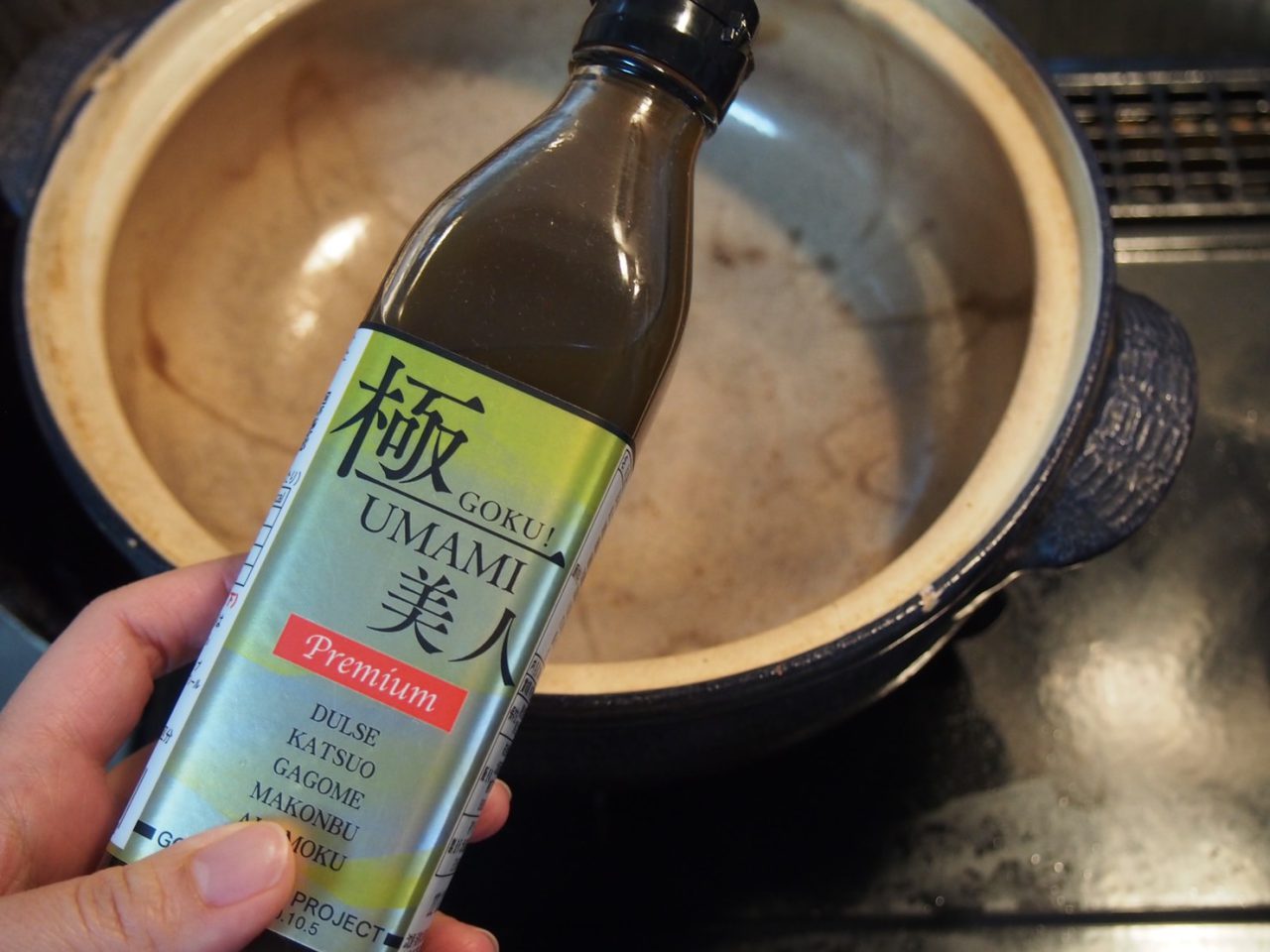 オリジナルレシピ:極UMAMI美人を10倍水割りにしたものに、家にある根菜や肉を入れ、野菜が柔らかくなるまで煮込みます。