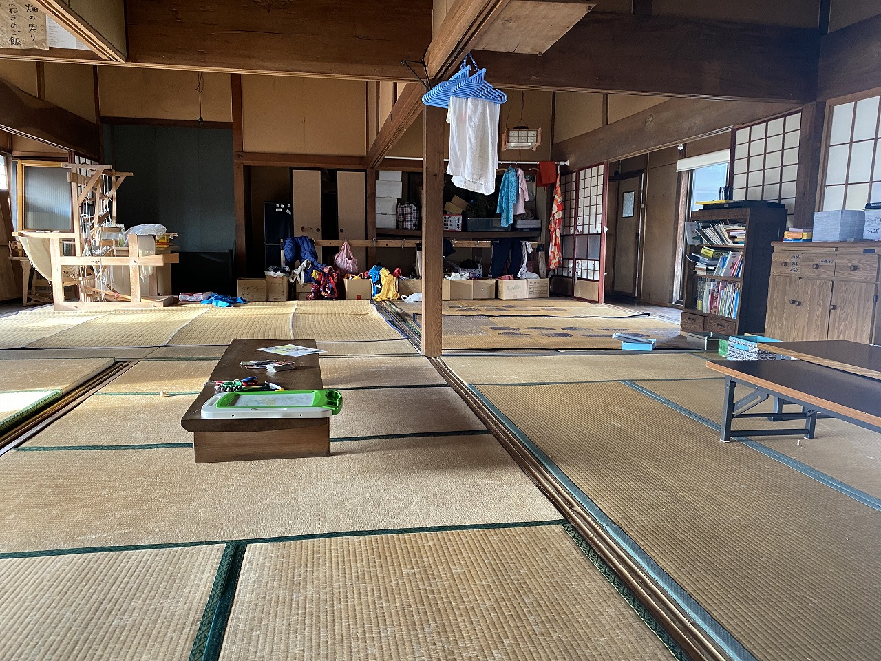 手作りの暖簾(のれん)をくぐって入った先は、昔ながらの土間があり、貴重な機織り機が置いてあるなど、なんだかトトロの時代にタイムスリップしたかのよう。そしてびっくりしたのは、この場の他に地元の方に畑を提供してもらい、区画ごとに子どもたちが野菜や果物を育てているんだとか。自分たちで育てたキュウリやトマトがおやつになることもあるそうで、本当にトトロの世界だと微笑ましくなりました。(畑の様子は【後編】でご紹介します。)