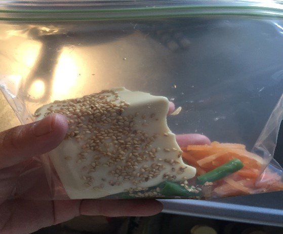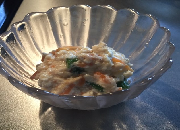 お豆腐をすりつぶす際に私は保存バックの中にゆがいたお豆腐を入れて揉んで、赤ちゃんの分だけ除いてバックに残ったお豆腐に味付けして白和えにしちゃいます。塩昆布やひじきなどや、あとは残ったお野菜などを入れてもおいしく、手軽に晩ご飯の一品にできます。具材はなんでも大丈夫!食欲があまりない日でも栄養満点で、中に入れる具によっては一品でも十分に栄養バランスがとりやすいです。離乳食が進んできたらお野菜を柔らかくして味付けを鰹節だけで行えば赤ちゃんへの一品としても栄養満点の主菜になります。(大人用は取り分けた後に味付けすればいいので)味付けはお味噌でも、めんつゆでも。おすすめはごま油とめんつゆを大さじ1くらいずつ(豆腐の量によりますが、3個パックの豆腐1個使うときはこのくらいの分量でしっかり味がつきます)