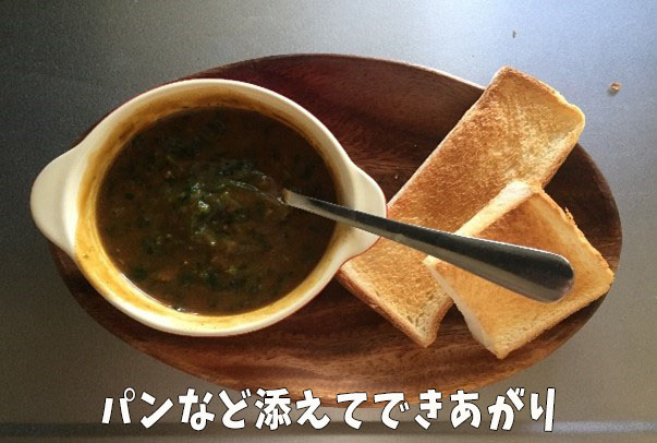 カレー屋さんで食べるほうれん草カレーって本当に好きでついつい毎回のように頼んでしまいます。おうちで気分だけでも味わえればということで、手軽に作れるほうれん草カレーを紹介します。時間がないときでも手軽に食べたいのでレトルトカレーを使います。レトルトカレーにほうれん草のペーストまたはペーストにする前にきざんだものを混ぜて電子レンジでチン!最後にちょっと一足しで黒こしょうとコーヒーフレッシュをかけてみると本格的です。ナンで食べるもよし、家にはそうそうナンはないので、おうちにあるパンにつけて食べるもよし。チーズとも合います。