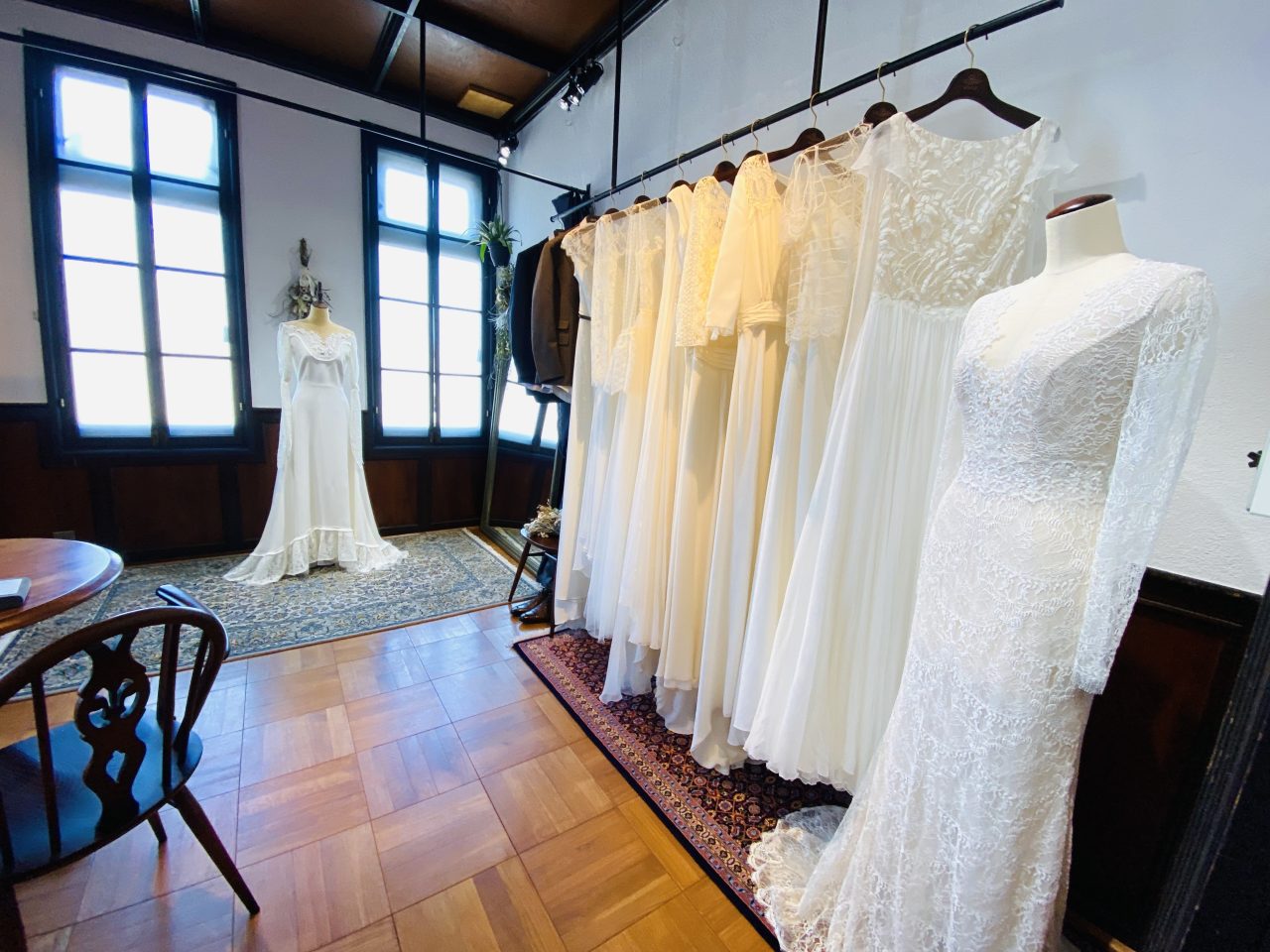 シンプルだけど細部までこだわりが詰まったシックなドレス。店内のインテリア、窓から見える景色、すべてがうっとりするような空間でした。