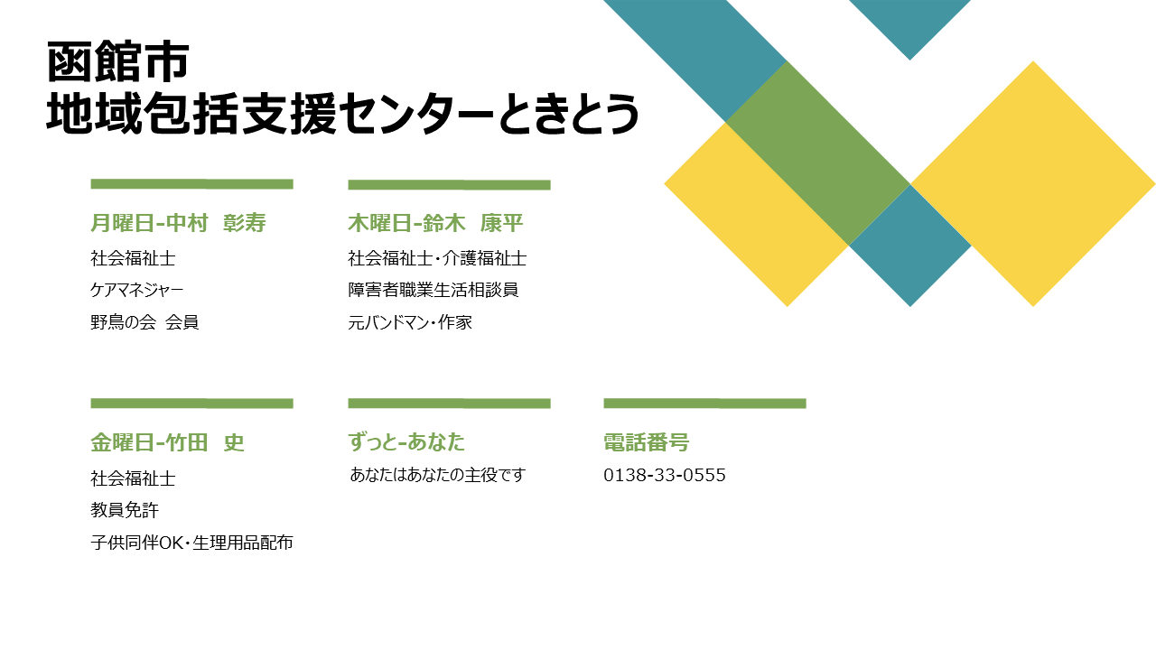 世代を問わない相談窓口【函館市地域包括支援センターときとう】さんの取組みをご紹介しています♪