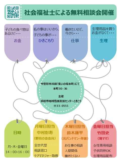 今回、曜日別に「集いの場 本町」にて何回でも受けられる無料相談会が設けられます。