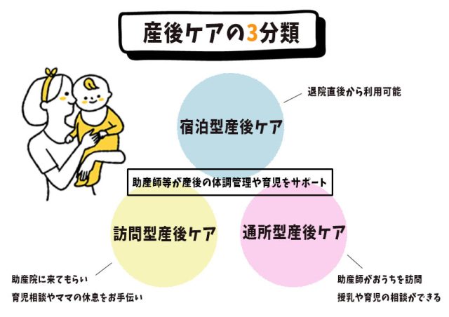 産後ケア赤ちゃんがうまれて病院やクリニックの退院直後に利用できる宿泊型産後ケア、助産師がおうちに訪問してママから授乳の相談や育児の相談を受ける訪問型産後ケア、当院のように助産院にきてもらって休息をとるような通所型の産後ケア3種類があります。(国でも産後ケアの分類はこの3種類です。)