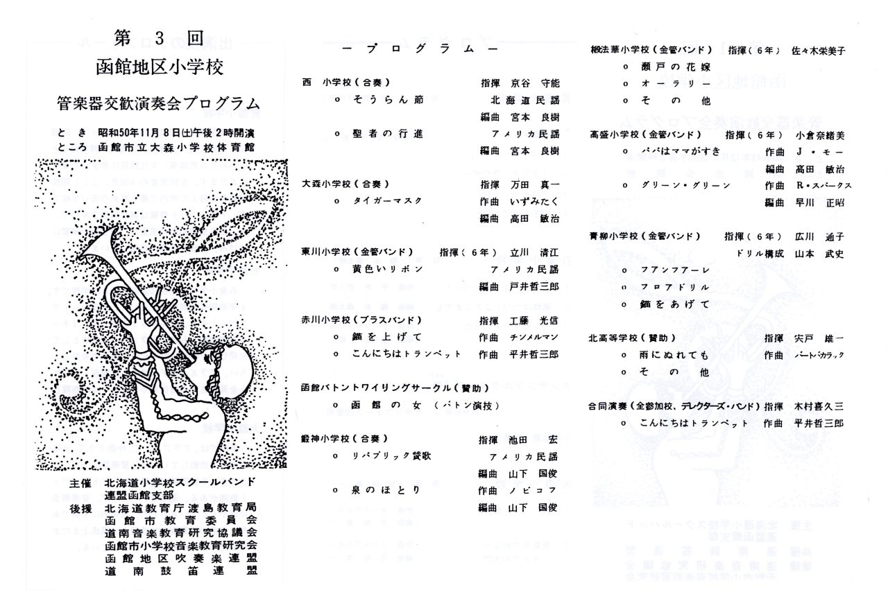 第1回の演奏会は昭和48年12月1日、函館地区小学校管楽器交歓演奏会として市民会館で実施。参加校は、函館市立青柳小、函館市立大森小、森町立石倉小の3校。昭和56年からは函館地区小学校マーチング交歓会も開催され、このマーチング交歓会は平成8年まで行われた。函館地区管楽器演奏会と名称が変わったのは昭和58年。以来、インフルエンザやコロナウイルスの流行のため中止になった年度もあったが回を重ね、令和4年度で記念すべき50回を迎えた。ちなみに、私が指導に係わった学校がこの演奏会に初めて出演したのは昭和50年の第3回大会。会場は、大森小学校(現 あさひ小)体育館。