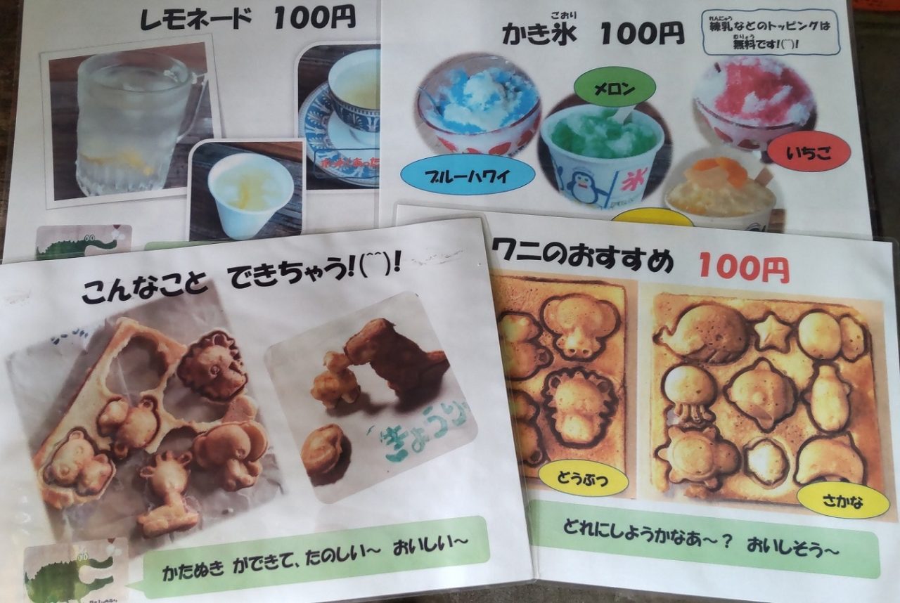 ③かたぬきができるワッフル【ワニのおすすめ】(100円)は4種類あります。個数が限られているので売り切れになることもあります。