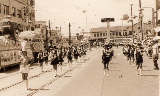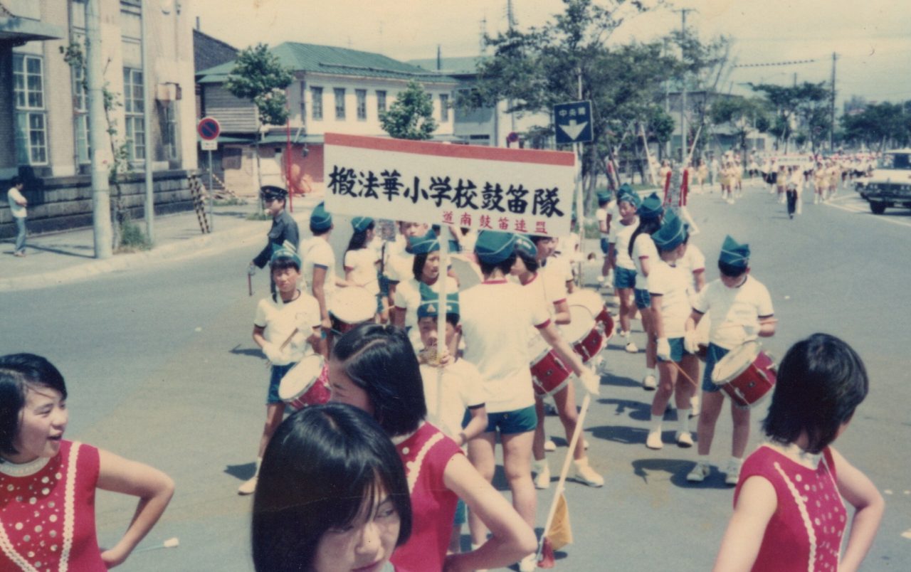 翌年(昭和50年)の8月3日、6年生の父母・田中教育長・交通安全推進委員会等のご支援で新調したユニフォームを着て「函館港まつりパレード」に再参加。演奏した曲は、「瀬戸の花嫁」。背景に写る旧函館駅舎が懐かしい。
