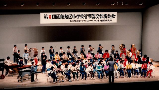 この年の秋、11月8日には、前編でも紹介した「第3回函館地区小学校 管楽器交歓演奏会」に初出演。演奏曲は、レパートリーが増えて「瀬戸の花嫁」「サザエさん」「オーラリー」「エルランチョグランデ」の4曲。演奏会の最後には、出演校全メンバーによる合同演奏が。曲は、トランペット鼓隊の入門曲「こんにちはトランペット」。