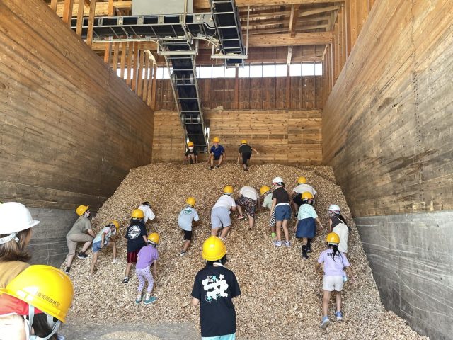 森町にある木材加工の工場見学です。山に生えている木が、どうやって加工されるのかを実際に目で見て知り、学びます。加工の際に出た木片チップの山は子どもたちに大人気。みんな解き放たれたように山に駆け登っていきます。迫力のある大きな機械、木を削る音、木の香り、木の肌触りなど五感で感じます。