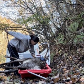 そして昨年11月に猟師としてデビューしました!今年4月からは有害駆除員としても活動しています。活動していると、「収穫目前の野菜を食べられてしまった」「庭から眺めるお花を楽しみにしていたのに蕾を食べられてしまった」「鹿が飛び出してきて廃車になった」「樹皮を食べられて木の値段が下がった」など色々な鹿から受ける被害の話をよく耳にします。そんな状況を少しでも改善すべくわたしは鹿を獲ります!