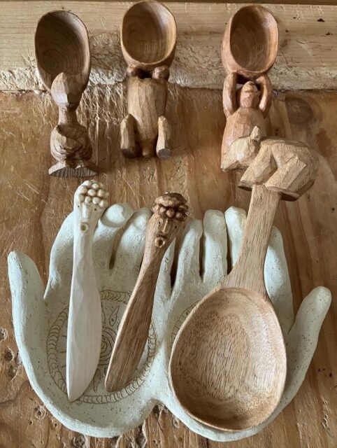 すぐに八雲町木彫り熊資料館に足を運び、作品を間近で見た笹田さん。自宅庭の桜の木を剪定し出た枝を削り、見よう見まねでクマのスプーンを作ってみたのが始まり。その後は厚沢部町から仕入れた木材や、友人宅の庭の木、古材など、なるべく身近な材料で無駄なく制作しています。独学で試行錯誤を繰り返し、現在はYOUSUNの作家名でクマのスプーンやバターナイフ、コーヒーメジャースプーンなどのカトラリー、オブジェなどを販売。