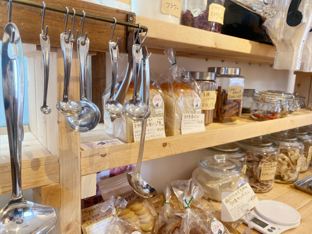 Bitteでは、塩や小麦胚芽、米粉、オリーブオイル、こめ油、大豆ミート、ドライフルーツなど北海道ではここでしか買うことができない商品もたくさん。食品だけではなく洗剤などの日用品も取り扱っています。環境にも配慮した量り売りスタイルですので、空き瓶や紙袋、シリコンバックなどを持参し必要な分を調達できるのも嬉しいポイント。リユース瓶の用意もあるので手ぶらでの来店ももちろんOK!