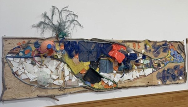 海洋ごみを活かしたアート作品を手がけ、海ごみの現状や生き物への影響などを表現しています。こちらは、八雲町にあるぺコレラ学舎の壁に、子どもたちと一緒に作った大きなくじらのアート作品を総合監修させて頂きました。