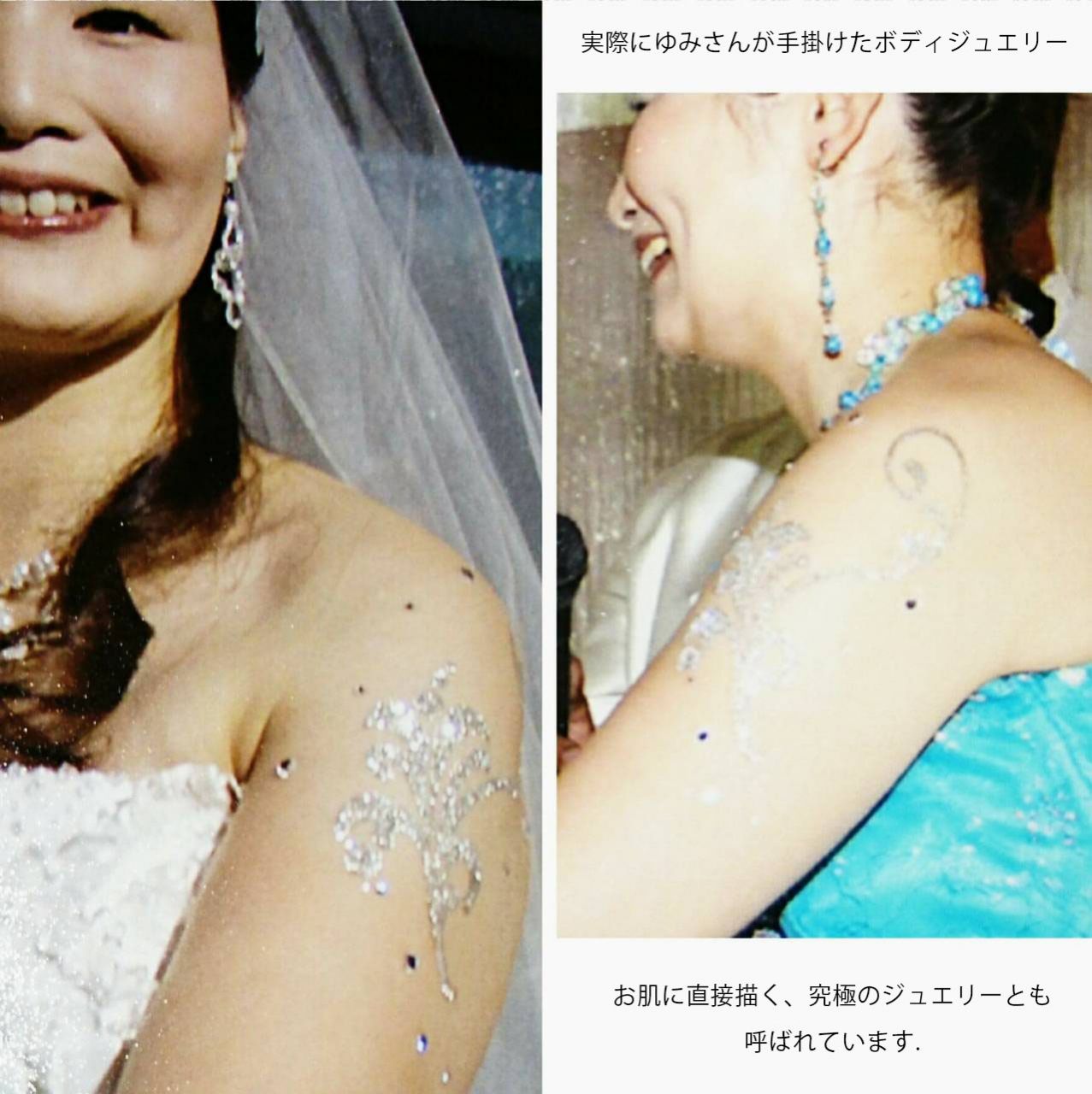 ※ボディジュエリーとは、ボディ用の特殊な接着のりを使用して、ラメカラーパウダーで、肩・デコルテ・腰・腕・足などに「キラキラ」のイラストをアートする方法です。