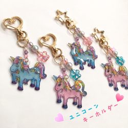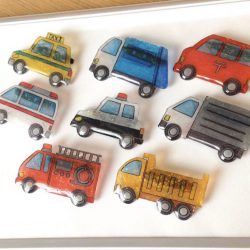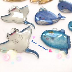 プラバンという板にイラストを描き、オーブンで加熱することで出来るモチーフ。そこにレジンという液体をのせ、固めることでぷくっとツヤツヤした仕上がりになります。出来上がったものをキーホルダーやアクセサリーにして楽しめます♪