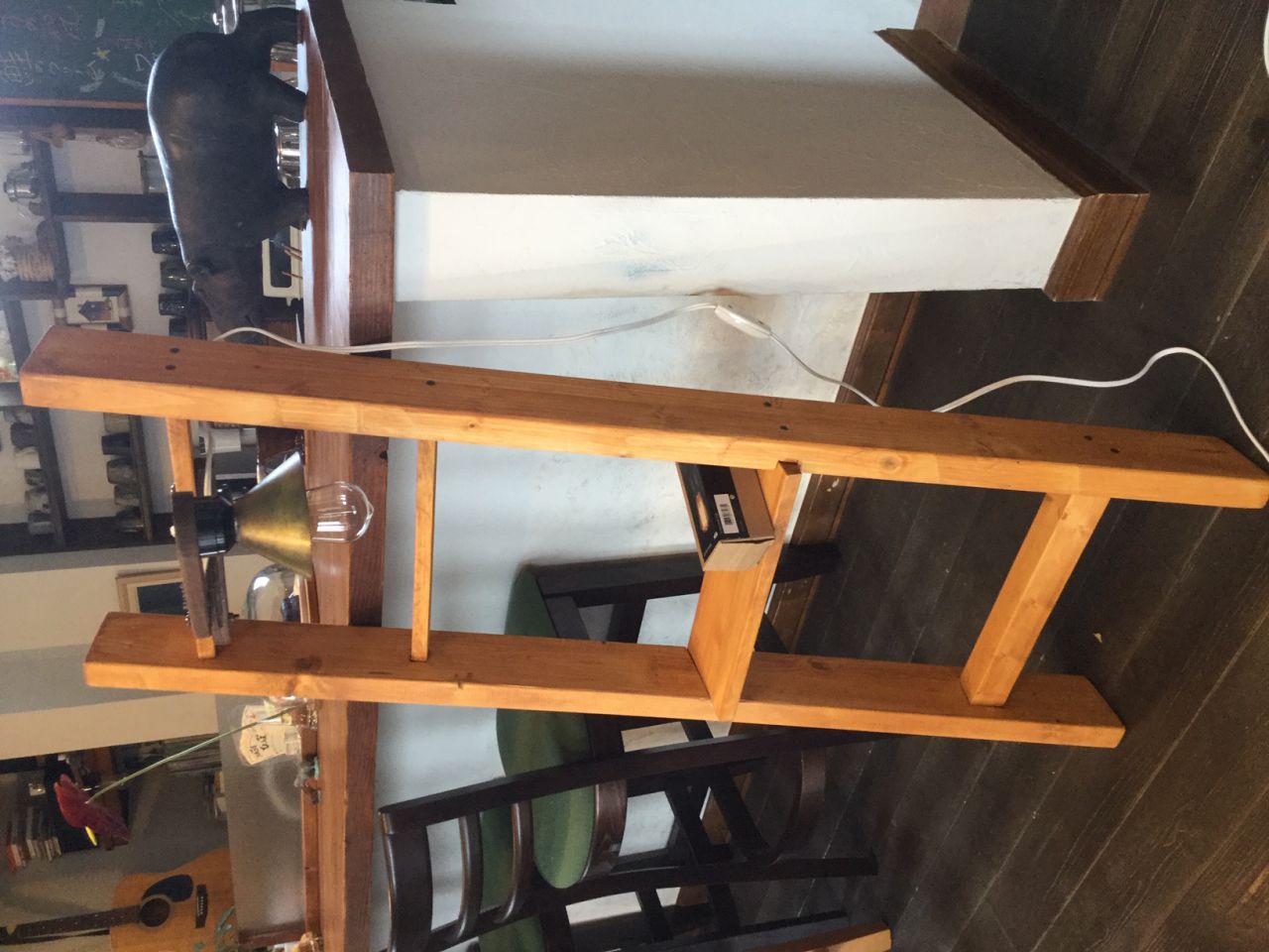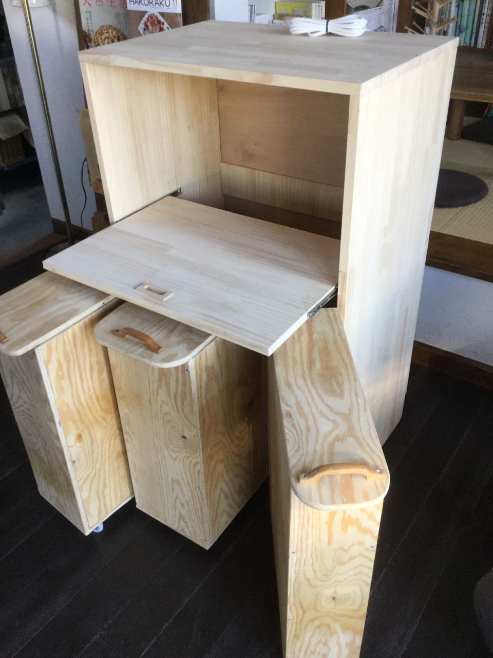 上に電子レンジ、スライドする中の棚に炊飯器、内側奥にコンセントもつけました。このサイズで、と図面をいただき作りました。白木保護の塗装で仕上げています。「ゴミ箱良いヤツみつかりましたか?」と伺うと、ちょうどのがなくて、ということで追加でゴミ場も作ってしまいました。置く場所に合わせてジャストサイズ、既製品ではなかなかないものです。